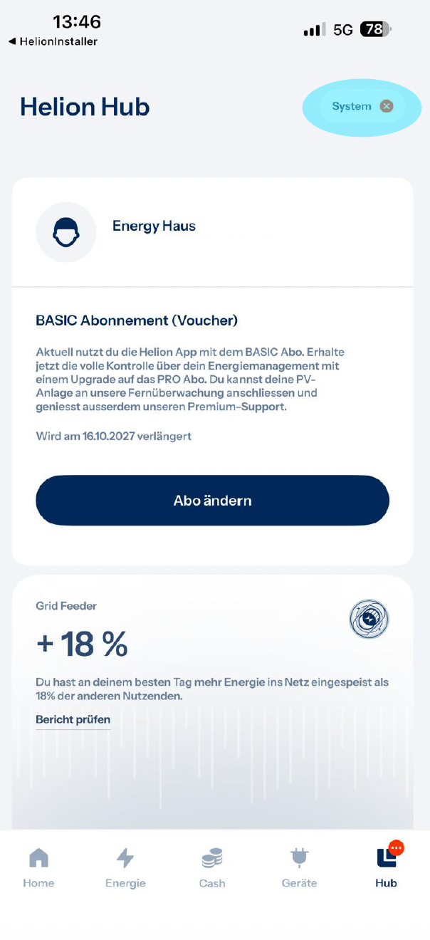 - Öffnen Sie Ihre Helion ONE App und klicken Sie unten rechts auf «Profil» oder «Hub»